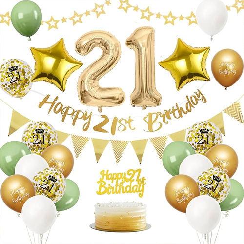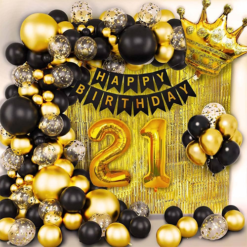 Arcus coronae balloon pone: Hic 21th balloon sertum arcus principali colores posuit colores nigros, aurum, argentum, etc., quae ornamentis viris et mulieribus aptissima est die 21 natalis partium. Ostiae vel parietis suspendi possunt et etiam aptissimi sunt ad usum tectis ac velit ad partum diem natalem 21 singularem pro viris vel mulieribus.