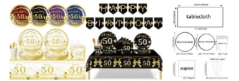 Charta natalis topper: sicut nucleus item placentae ornatum, principale chartam accipit verba "beatus dies natalis 50 annorum" sicut nucleus, et praecipuum placentae ornatum cum pompa, astris, pileo natali aliisque figuris congruit. Circumfusa "50", felicissima nubes, coronae et aliae chartae mini, e chartae incrassatae factae et cum baculis solidis bamboo aequatae, cum cupellis et mensae mensae exquisitis singularibus ornari possunt.