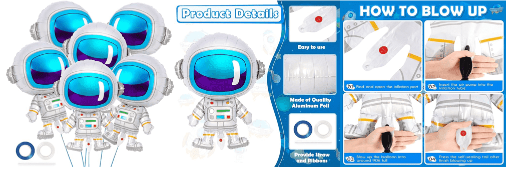 Sunt astronautae communes figura corporis plena, ostendens imaginem astronautarum gerens spatium sectae, stylos quosdam cum basi, inflatable stare posse. Magnitudines variae sunt, ut 18 pollices, 24 pollices, 28 dig, etc., necnon aliquot pisces maiores, ut stantes astronautae pisces cum altitudine 65cm. Maxime adhibitum est pro spatiis lemmatis nataliciis, infantibus acceptis, ornamentis cubiculi natorum aliisque occasionibus, quae spatium atmosphaeram laetum eventui addere possunt.