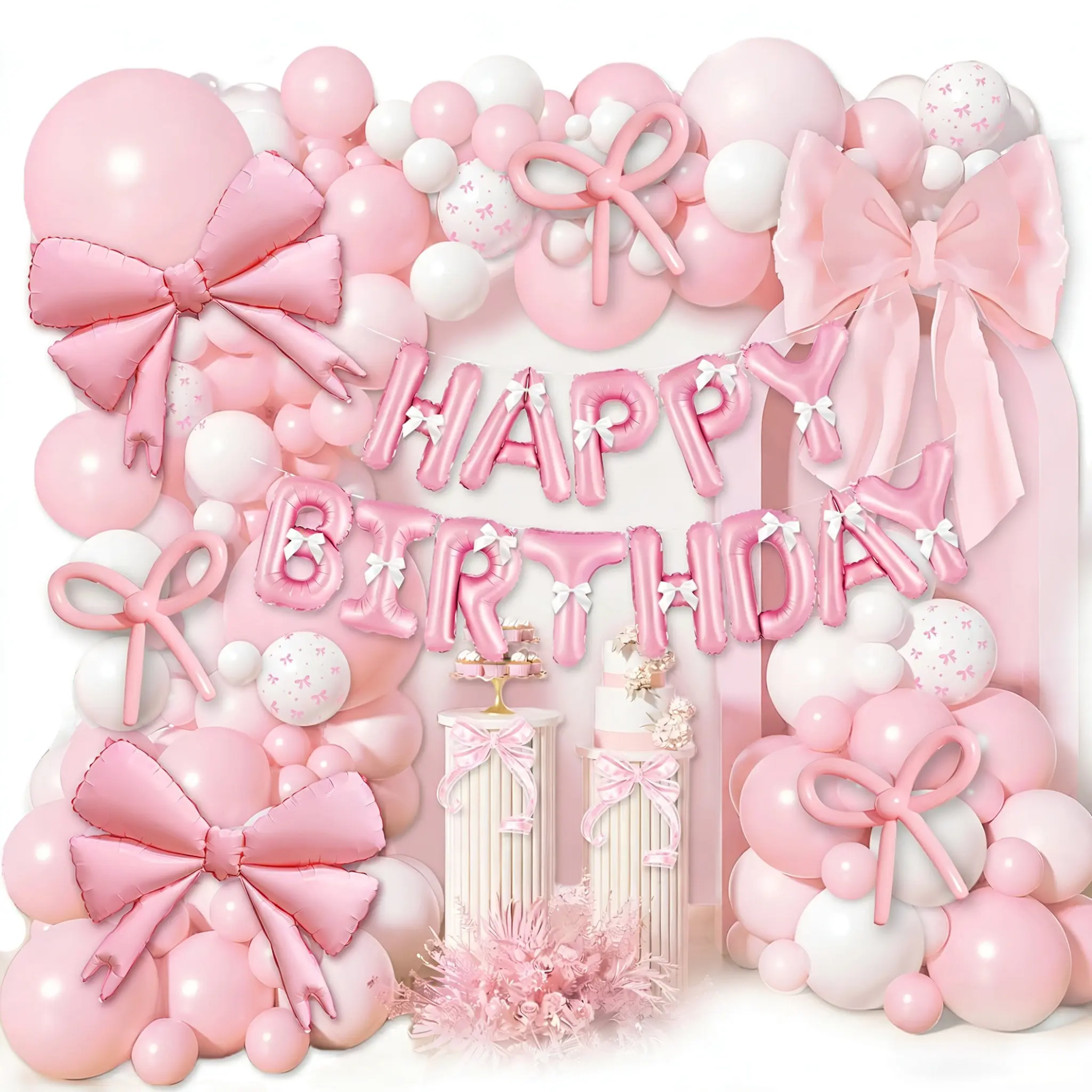 Hoc institutum includunt matte infantem roseum Balloon in 5inch, 10inch, 12inch et 18inch, matte color albus in 5inch, 10inch, foil arcus roseus Balloon, matte infans roseus 260 longus balloon, arcus vitta, gluten dot et ornamentum Balloon habena.