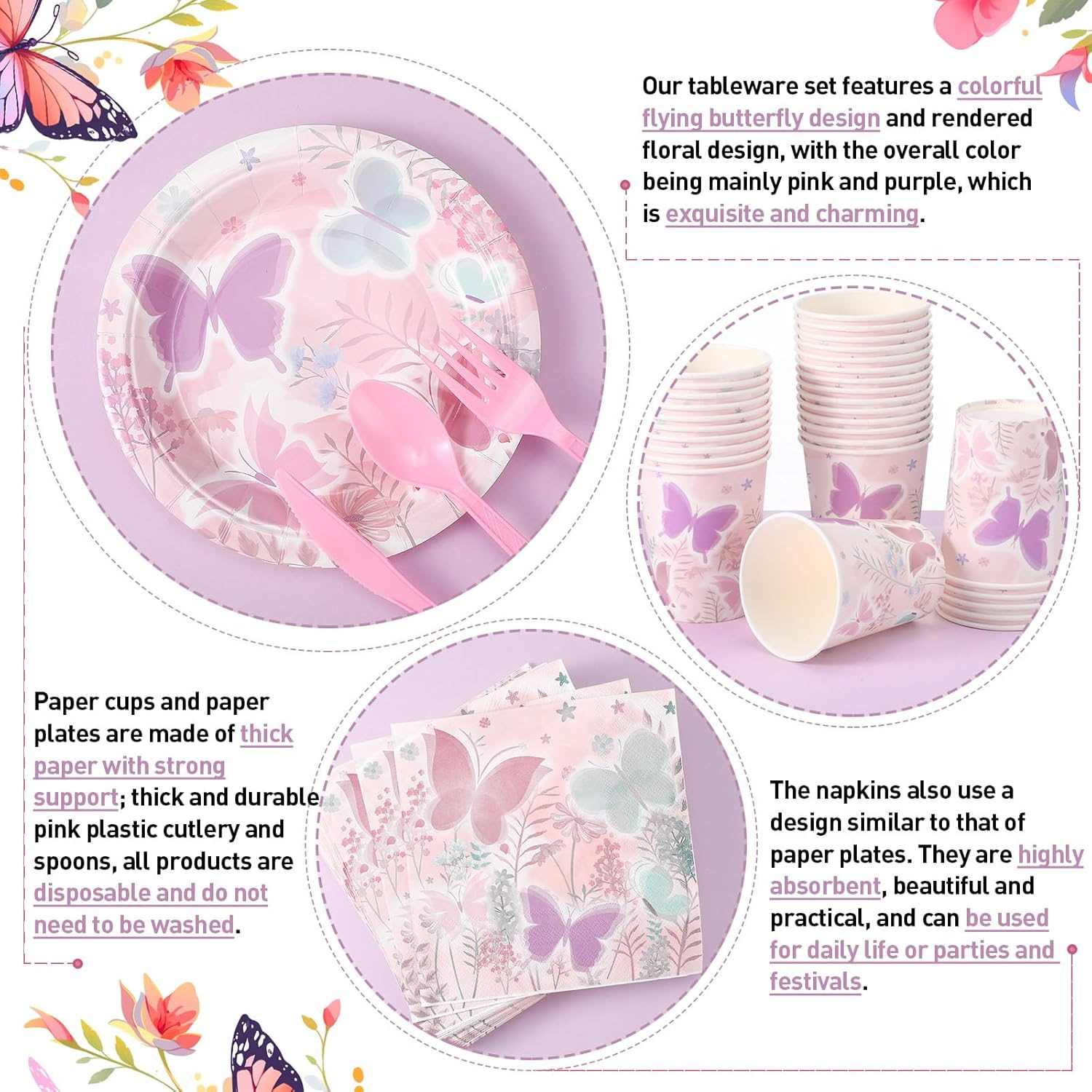 Mappae eundem stilum cum themate habent. Pulchra papiliones et flores ostendunt. Charta crassa et mollis sentit. In aqua bene accipit. Ad purgandum in refectio operatur. Potest etiam esse parva mensa detail quae partium vultus delicatus facit.