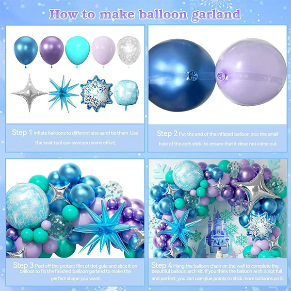 Ornamentum glacialis factio ornamentorum balloon coronae a populari IP Frozen accipit. Colores e pellicula accurate exprimit. Colores frigidiores componit sicut caeruleum, argentum, purpureum et candidum. Caeruleum est sicut arendelle matutino caelo. Lucerna purpurea est sicut rutilans refringitur a crystallis magicis. Argentum ornamenta sunt instar nivis repercussio. Colorem systema fabricant stratis pinguibus. SOMNICULOSUS et elegans usu visuali creare faciunt.