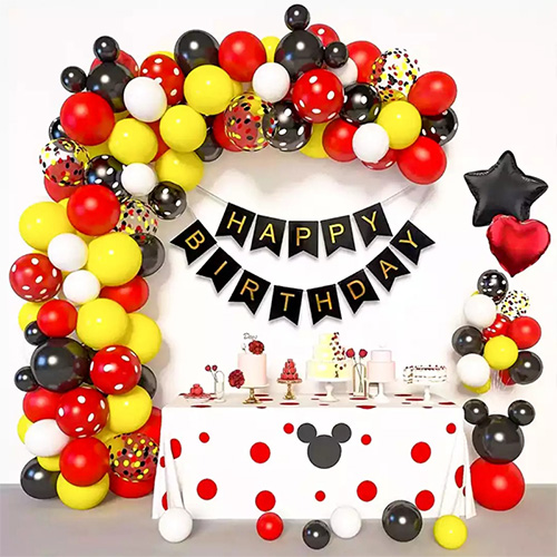 HocMickey Muris Balloon sertum arcusmaxime available in rosea et rubra seriei, comprehendoAliquam pisces, ffoyle pisces, charta natalicia vexilla, claua aulaea et alia accessoria. Omnes accessiones huius sarcinae bonae notae sunt.