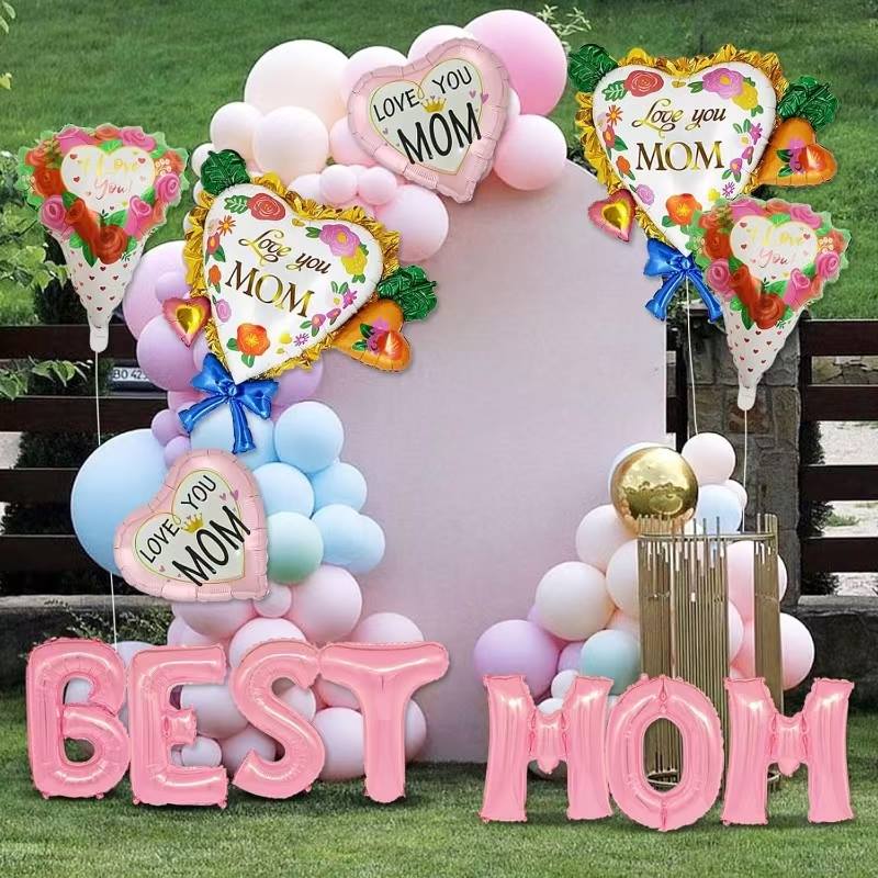 3. Matres Dies Litterae Foil Balloons: Matres Dies litterae claua pisces sunt vim creatricem ad traditiones ferias faciendas specialem sentiunt. Figurae 3D litterae factae sunt. Multis compositionibus veniunt sicut "Dies Mater Felix" et "MOM". Calentes colores delicatus habent sicut rosae aurum, aurum et roseum. Iis cum ornamentis ut stellae et cordis bracteae pisces aequare potes. Respiciunt distinctam et facilem.