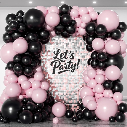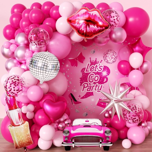 Includunt 5inch et 12inch matte rosea latex pisces, 5inch et 12inch margarita rosea latex pisces, 5inch et 12inch metallicae latex pisces rosei, 5inch et 12inch bracteae latex albae, 12inch rosei confetti latex pisces, 18inch roseum et album cor foil balloons, 18inch bracteae, bracteae bracteae roseae papilionibus ornamentis et accessoriis ut gluten punctis, balloons spoliant et vitta.