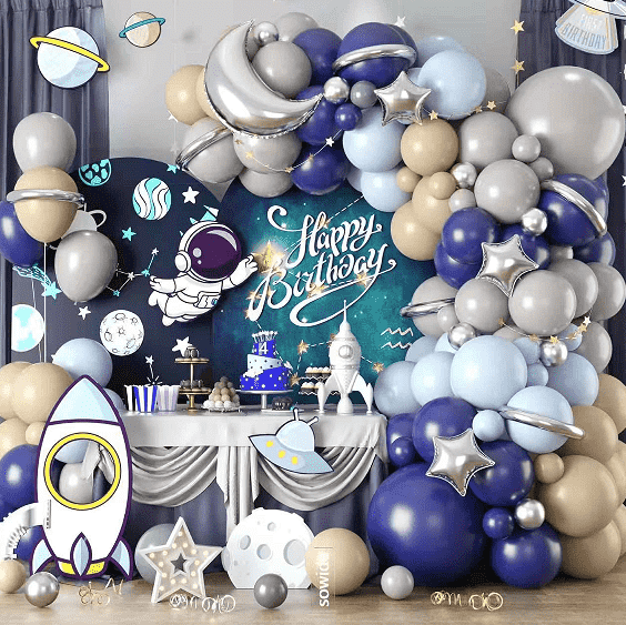 Spatium astronautae thematis factionis lamellae decorationis addere potest aliud genus ioci ad partem thematis spatii, ita ut triclinium etiam spatium atmosphaerae explorationis plenum sit. Inter eos mensaria elementa spatium accipit ut ratio inspirationis impressa cum astronautis, planetis, rockets et aliis exemplaribus, coloratis, durabilibus et facile mundis. Vexilla chartacea ad partem visneti in eminenti loco suspendi possunt, cum emblematum spatii relatum vel exemplaria in iis impressa vivam partium atmosphaeram addere. In terminis tabulariorum, incluso laminis prandiis, poculis, cultellis et furcis, etc., argumenta elementorum spatii astronautarum integrantur. Imago astronautarum viverra in lamellis cenae imprimi potest, et scyphi in modum erucae vel planetarum designantur, ut pueri tabulae uti possint. In processu, etiam loci suavitatem sentire potes.