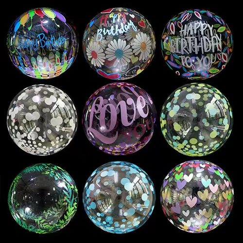 Nostram transparent Bobo Balloons fons ex materia C% TPU, quae in magnitudinibus inclusa sunt 10 pollices, 18 pollices, 20 pollices, et 24 digitos. Balloons magnitudines combining varias species potest creare sensum venustum layering.